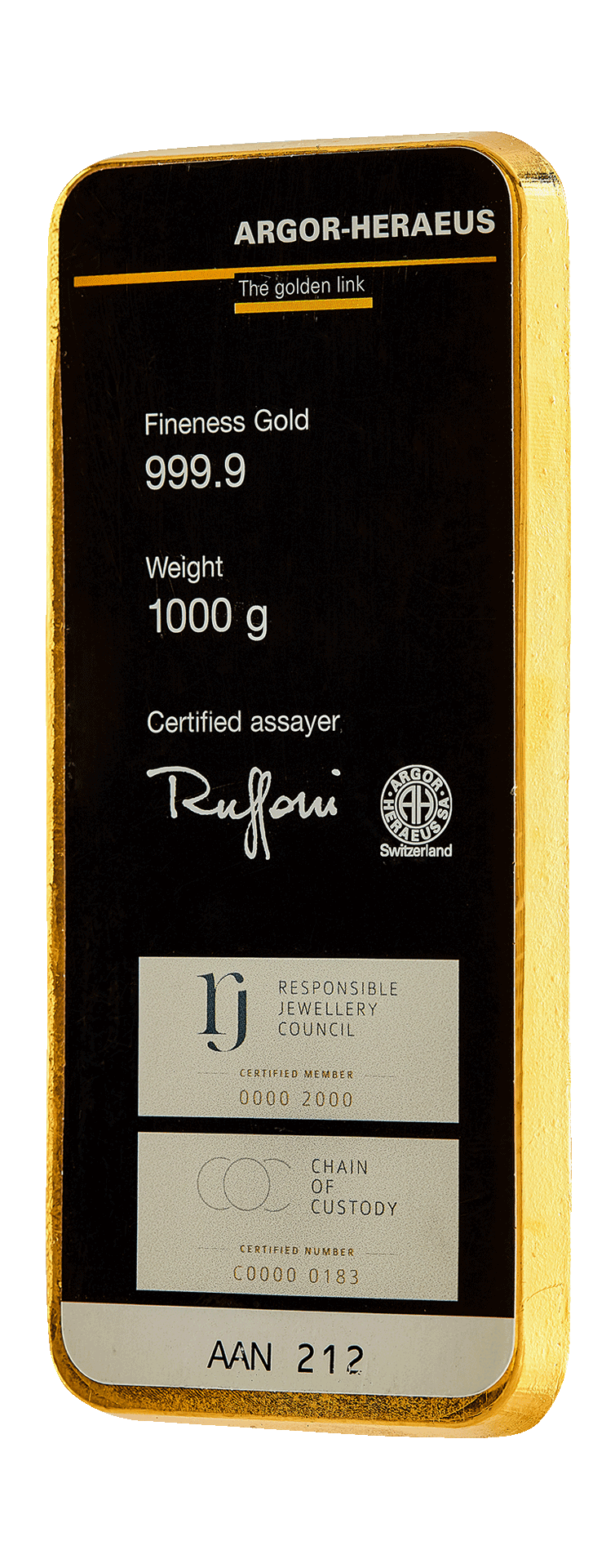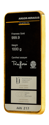 With a 1 kg gold bar from Argor Heraeus you are choosing almost 32 ounces in one piece. While gold bars up to 250 g are usually punched out and minted, heavier bars are usually cast bars. Gold is heated and poured into shape and, compared to the smoothed surfaces of smaller denominations, develops individual solidification lines during the cooling process. This uniqueness is not only a visual highlight, but also makes manipulation more difficult.