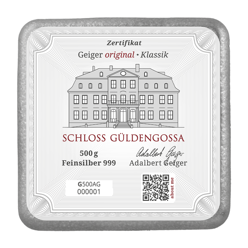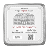 All bars are made of the finest silver (999/1000) and feature the Geiger Edelmetalle lettering with the famous Güldengossa Castle on the front.