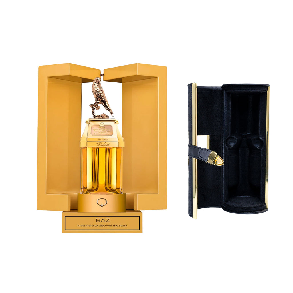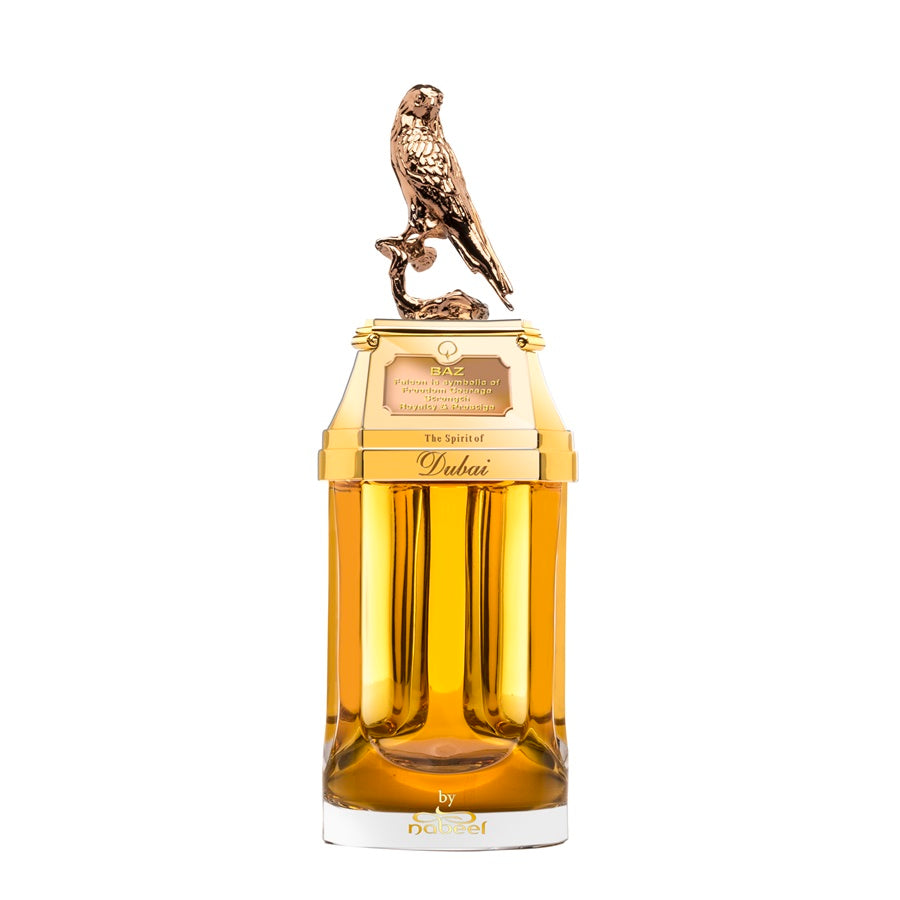 Dubai Rimal was the first generation product inspired by the desert. Baz is part of the second generation. Baz the falcon. An imperial bird. The ruler of the skies. When you go on a journey with Baz, close your eyes and breathe deeply. You will be filled with the smell of falcon leather and the woody scents of smoked olibanum, vetiver, labdanum and Indian agarwood oil.