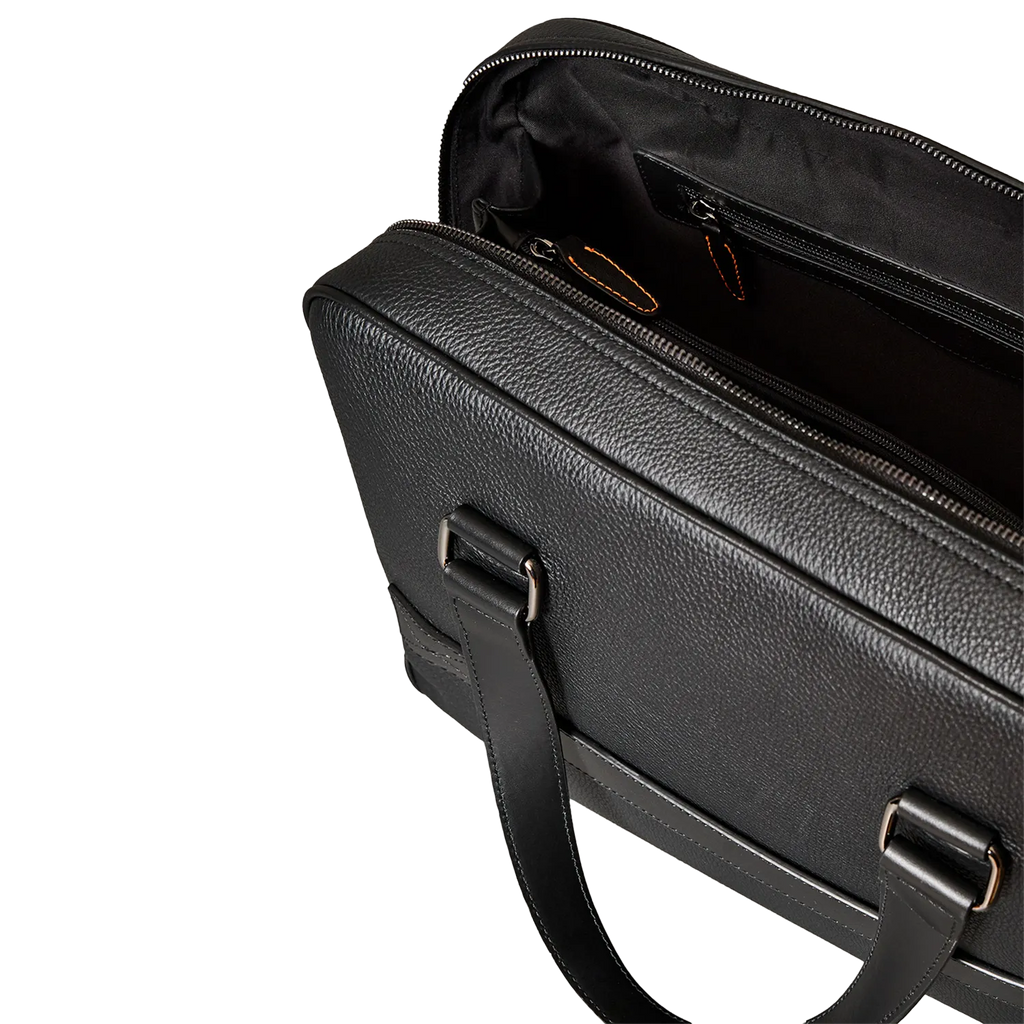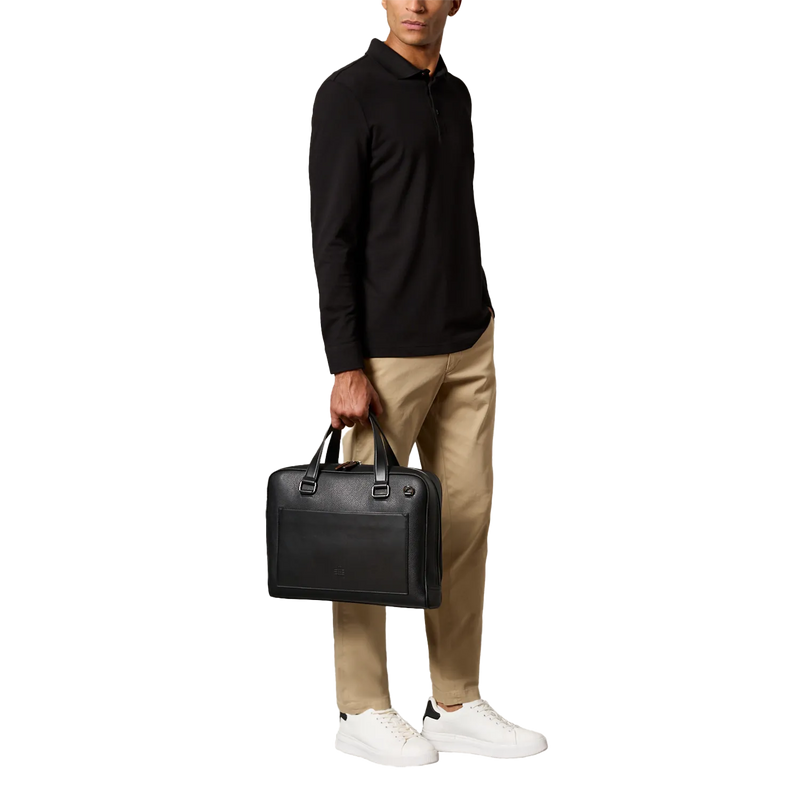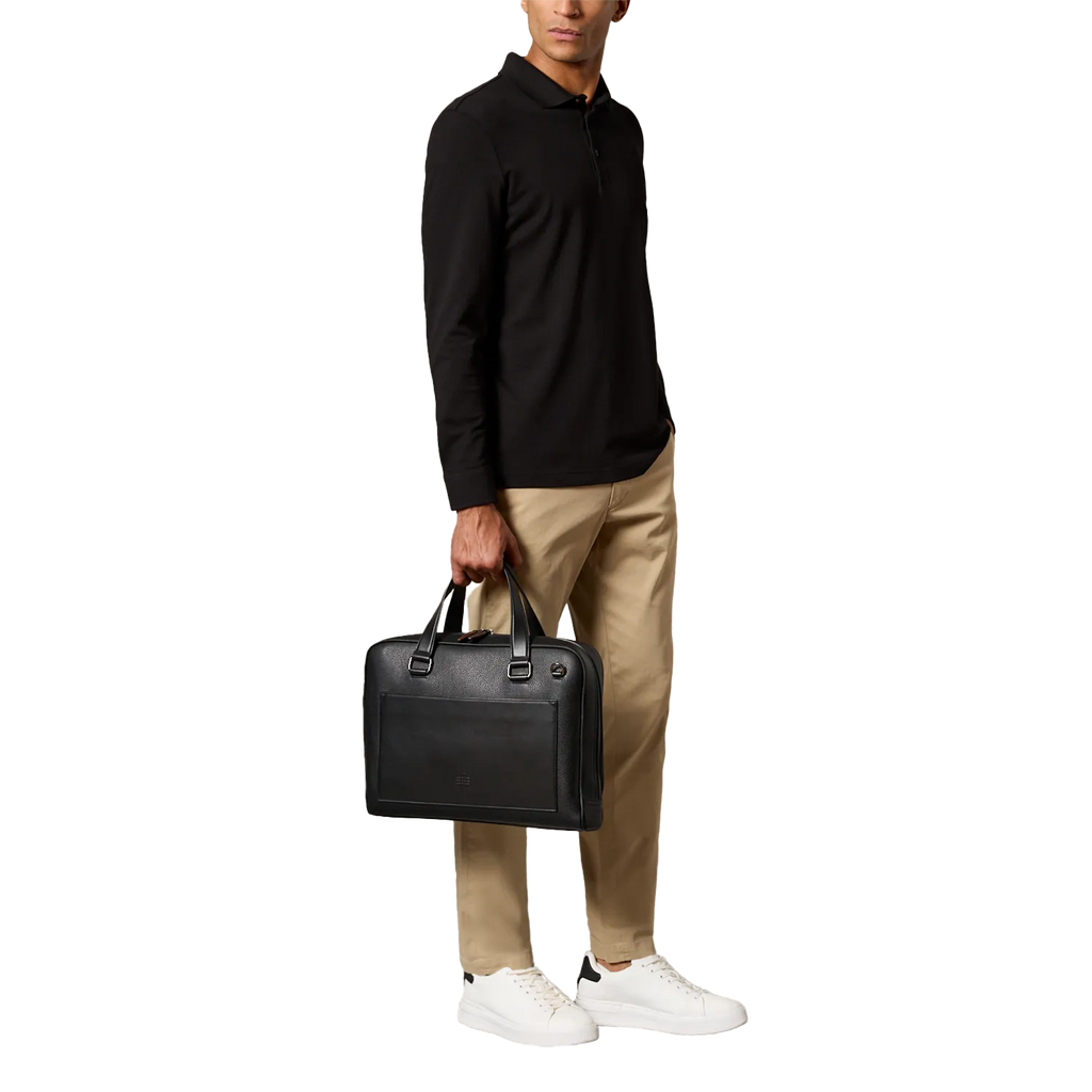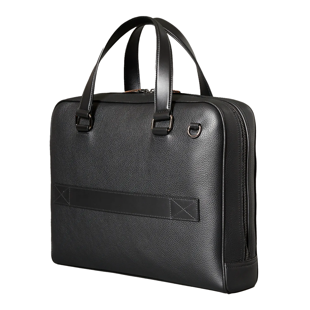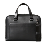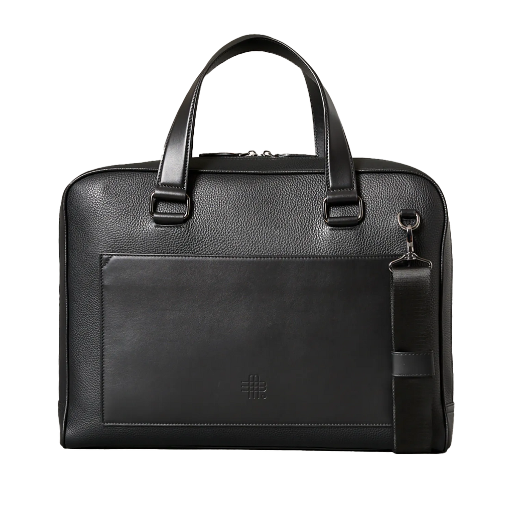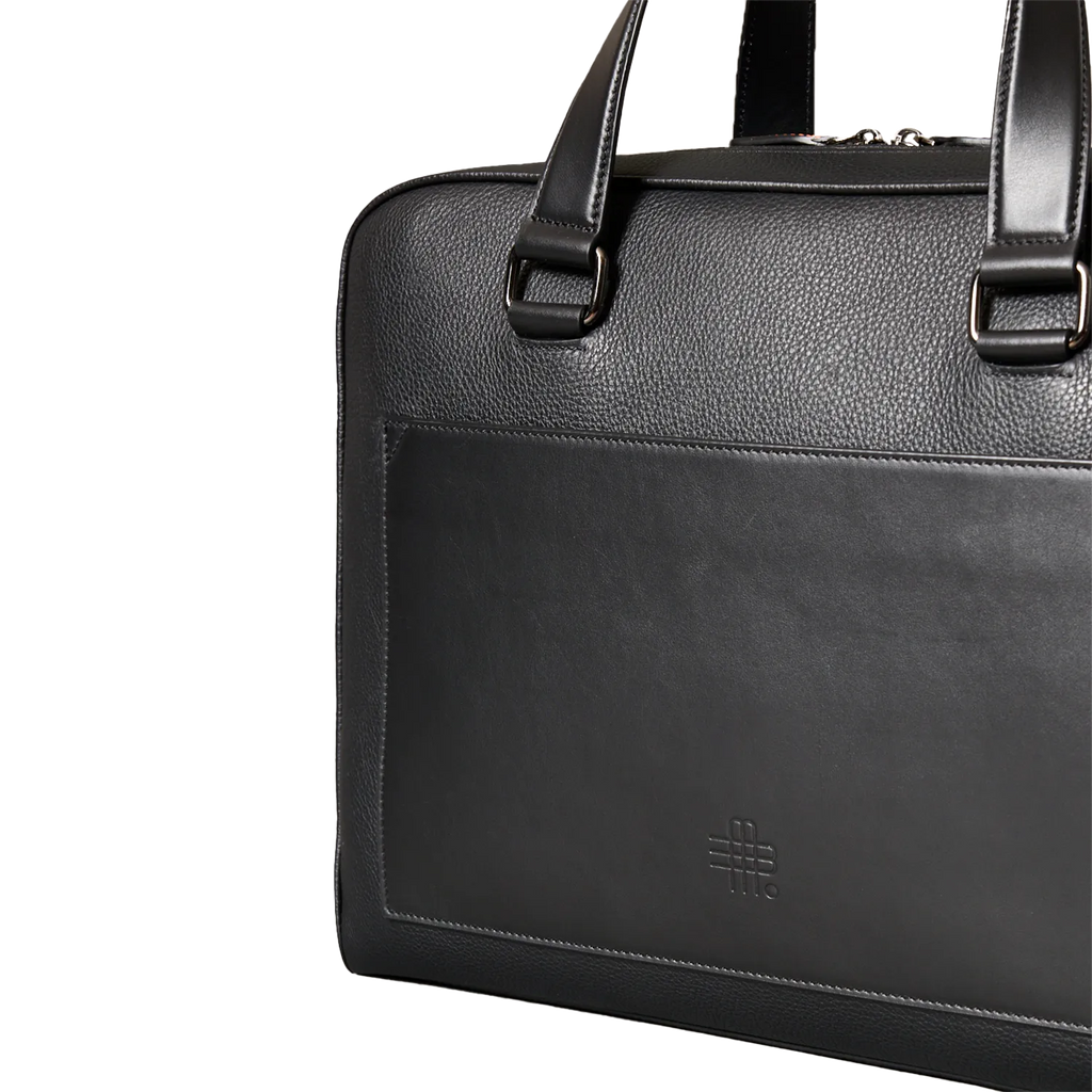 Handcrafted business bag made of fine, grained leather. The front pocket made of smooth leather offers a practical quick-access compartment. Equipped with a carrying handle, a trolley holder and a removable, adjustable shoulder strap, it can be worn in many different ways.