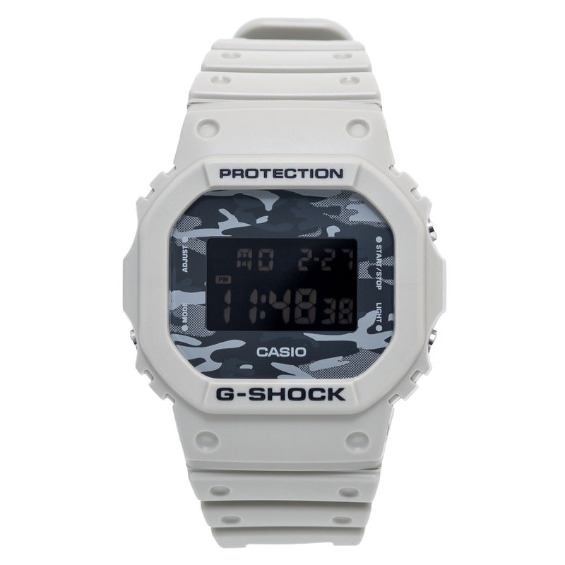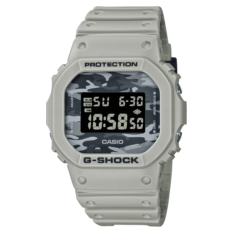 The iconic angular DW-5600CA comes with a beige camouflage pattern on the dial, perfectly framed by the single-colored, matte strap and case. The design of the G-SHOCK guarantees the ultimate style, whether in the urban jungle or in the real outback.