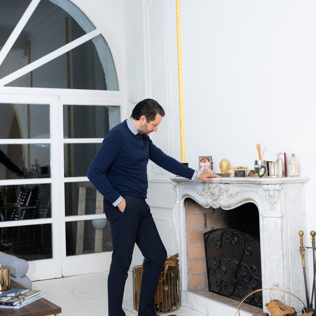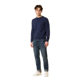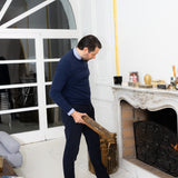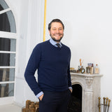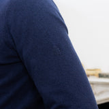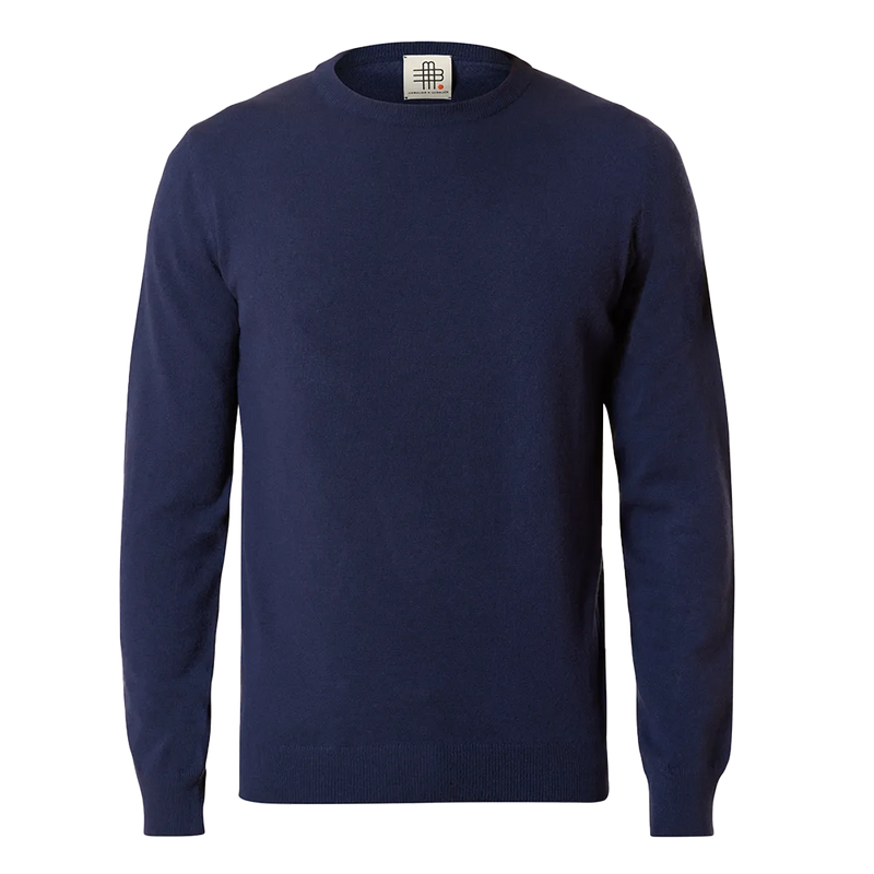 The highest cashmere-wool quality for this fine knitted roundneck jumper in night blue was used, limited and special. Tone on tone logo embroidery on the top arm.