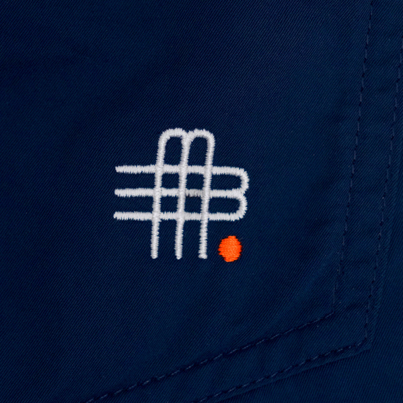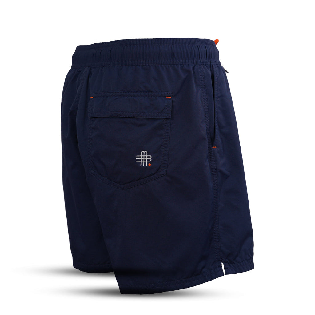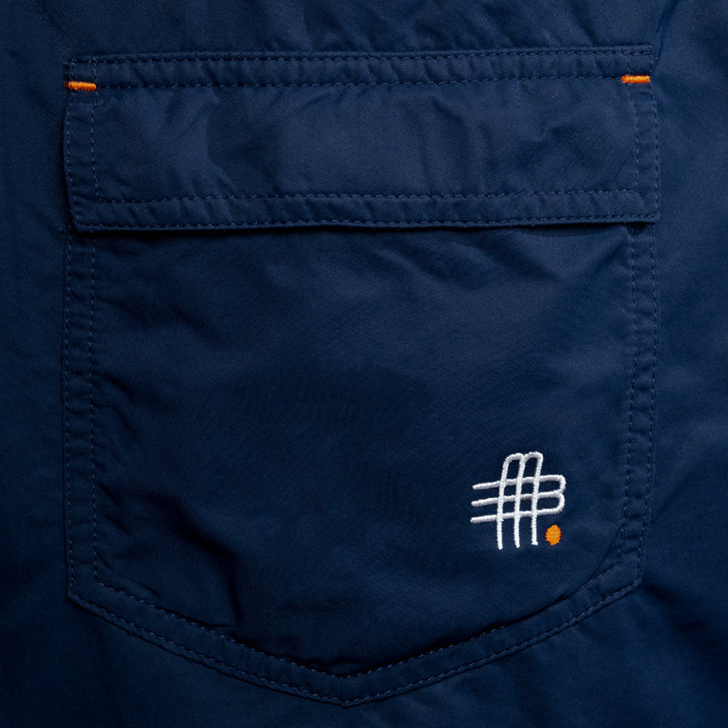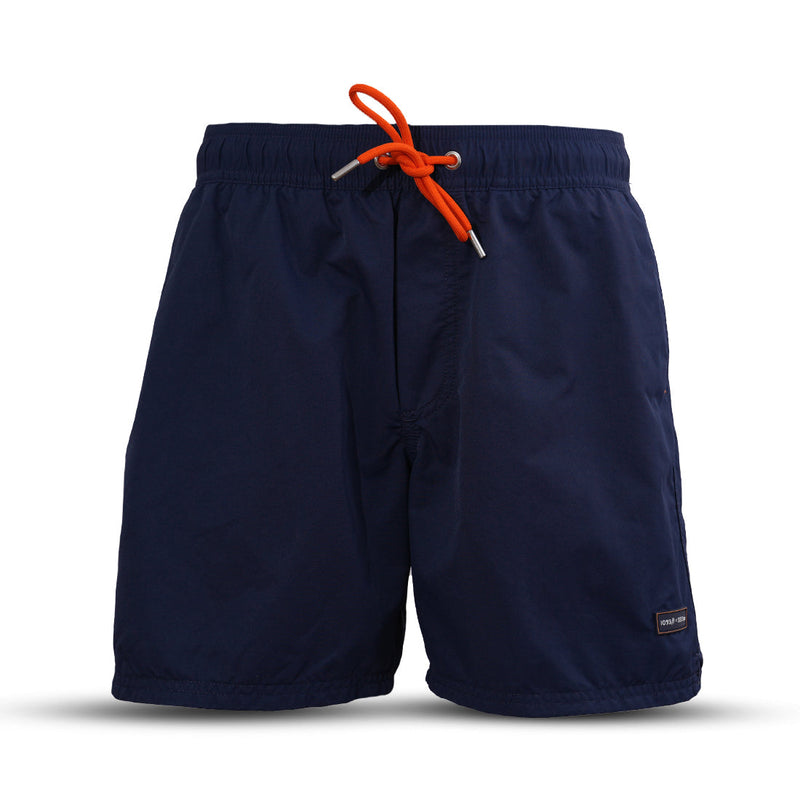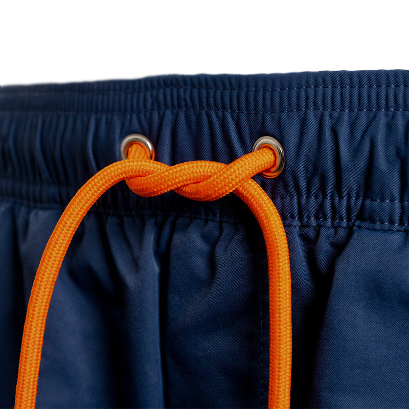 This smart classic short in ocean blue, is made for relaxation, with a comfortable elasticated waistband and an orange drawstring. They have two side pockets, as well as a back pocket with Velcro fastening. Logo embroidery at the back pocket and a unique rubber patch at the front.