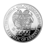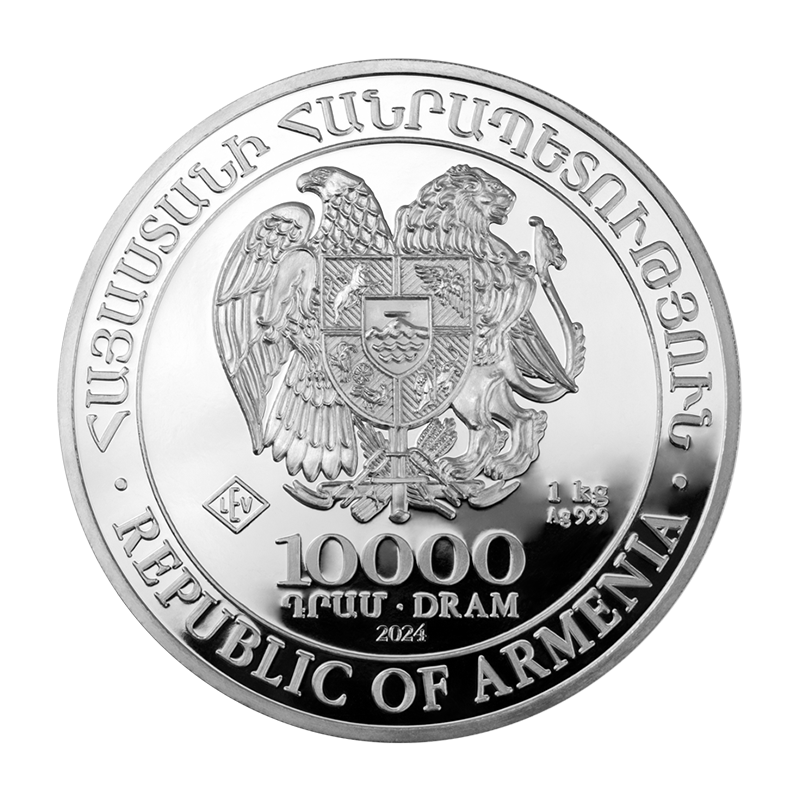 Die Vorderseite der 1 kg Silbermünze zeigt das armenische Wappen und den Schriftzug REPUBLIC OF ARMENIA. Darunter ist der Nennwert mit 10000 Dram angegeben, da Dram die offizielle armenische Währung ist. Auf der Münze ist die Feingewichtsangabe 1 kg Ag 999 angeben. Ebenso dezent ist das Prägejahr, unterhalb des Nennwerts abgebildet.