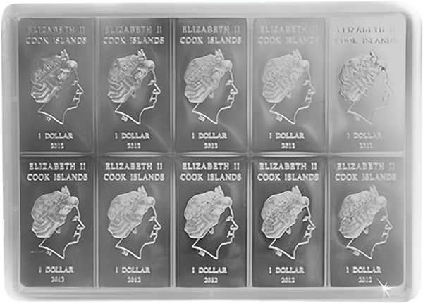 Die Barren selbst sind nicht nummeriert, aber sie werden in einem Blister mit Zertifikat geliefert. Die PVC-Kapsel ist versiegelt. Aufgrund ihrer ausgezeichneten Verarbeitung und des renommierten Namens von Valcambi haben die Barren einen sehr hohen Wiedererkennungswert und genießen in der Branche einen hervorragenden Ruf. Die Vorderseite zeigt das Porträt von Queen Elizabeth II. zusammen mit den Aufschriften "COOK ISLANDS," dem Nennwert "1 DOLLAR" und "2012". Die Rückseite zeigt ein traditionelles Symbol der Cook Islands sowie die Prägedetails wie "10g", ".999 FINE SILVER" und das Logo "ESSAYEUR FONDEUR".
