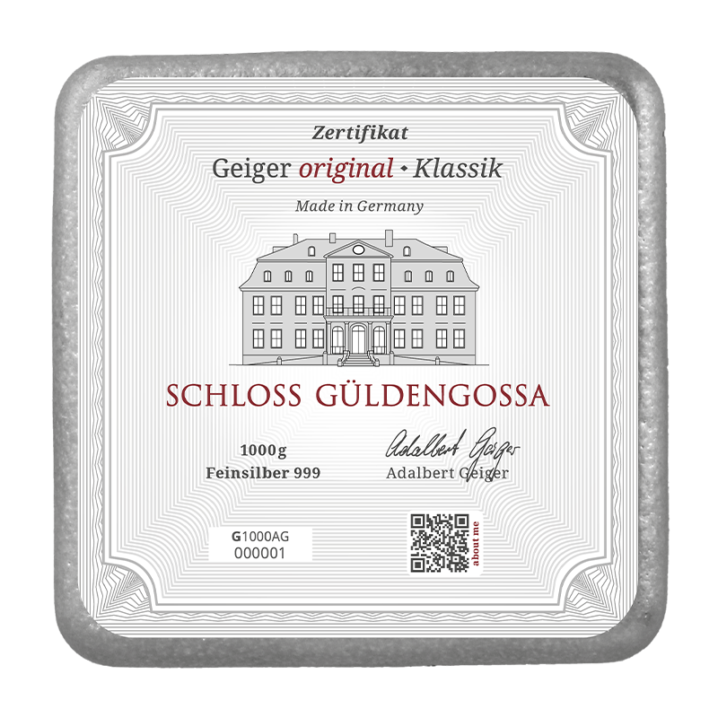 Alle Barren sind aus feinsten Silber (999/1000) hergestellt und zeigen auf der Vorderseite den Geiger Edelmetalle Schriftzug mit dem bekannten Schloss Güldengossa.