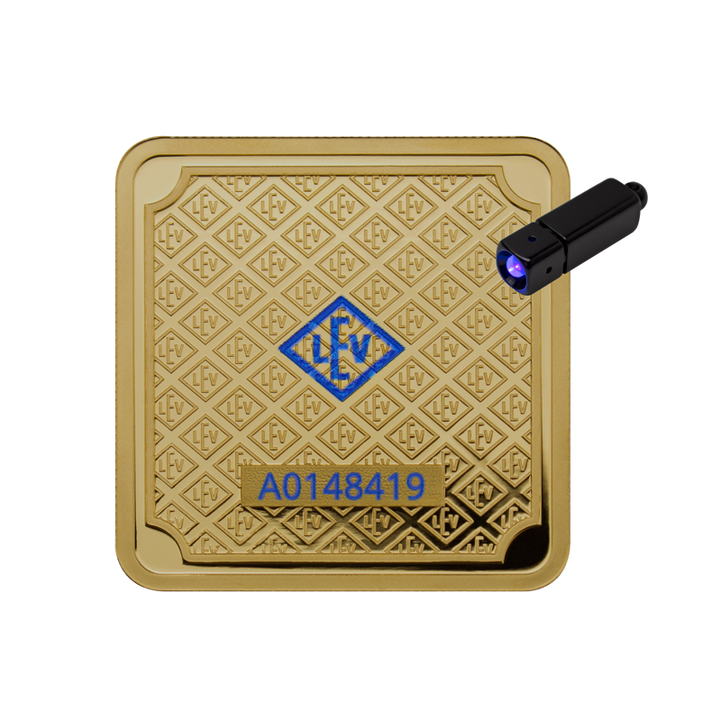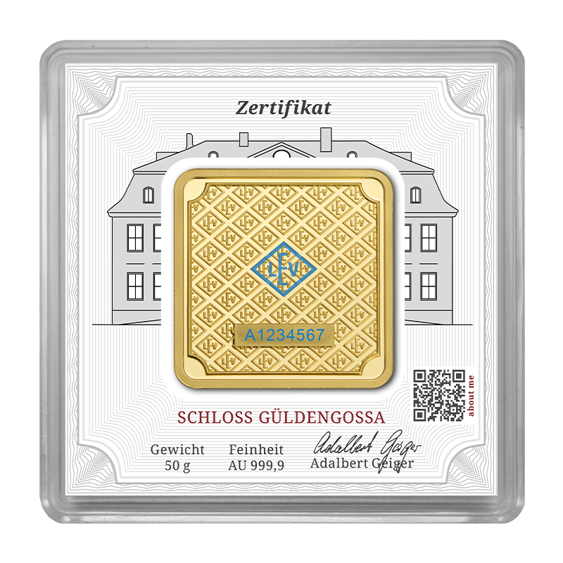 50 Gramm feinstes Gold sind in diesem Barren verarbeitet. Zusätzlich glänzt der Barren mit einer sog. pearl-finish Oberfläche und hohem geprägten Relief. Die Rückseite ist strukturiert mit dem Prägezeichen unserer Herstellerfirma der Leipziger Edelmetallverarbeitung (kurz LEV), was als Muster angeordnet ist. Der Prägebarren trägt einen besonderen, geriffelten Rand, welcher sonst nur bei Münzen üblich ist. Weiterhin hat der Barren eine blaue Sicherheitsbeschichtung auf der Rückseite, welches eine individuelle Seriennummer umfasst und das LEV-Prägezeichen. Unter UV-Beleuchtung fluoresziert diese Beschichtung.
