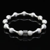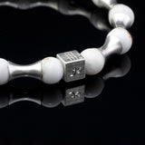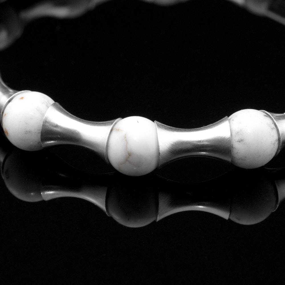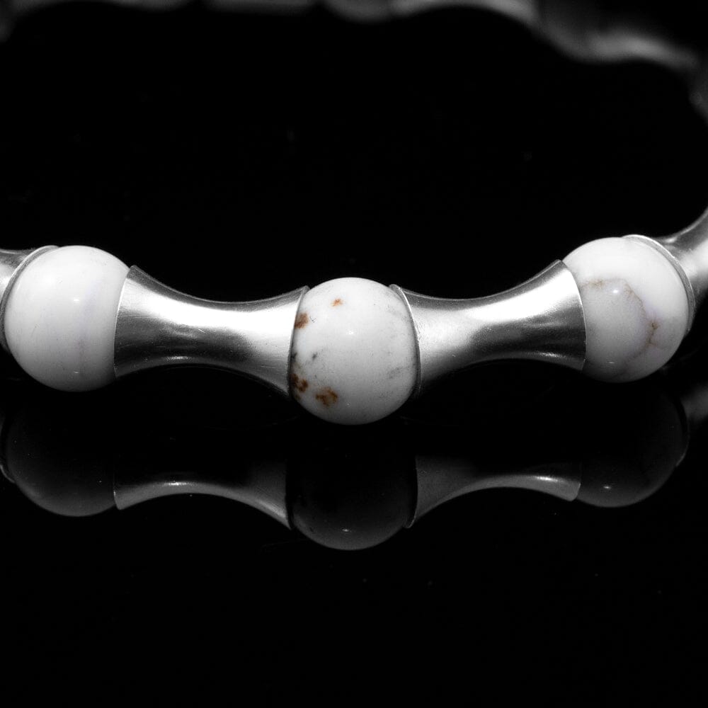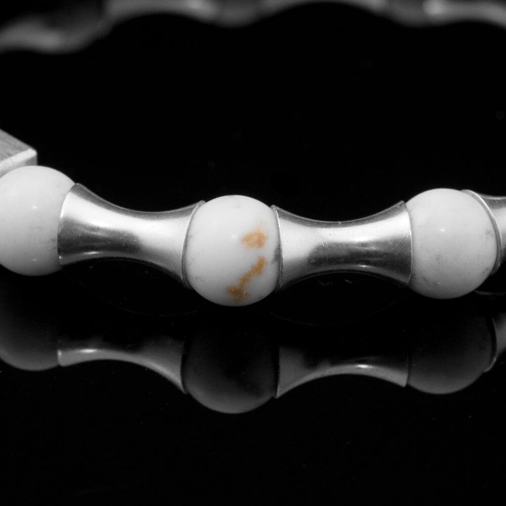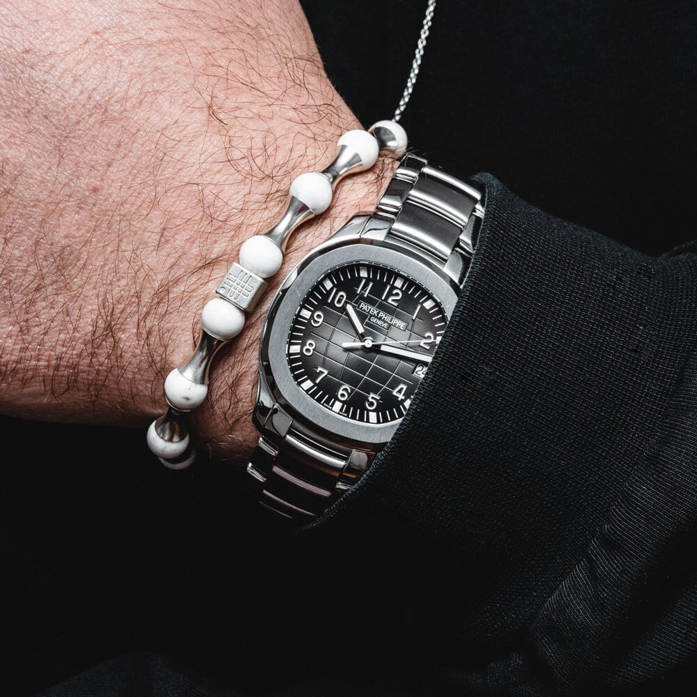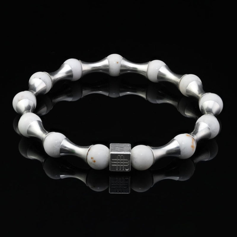 The collector item, the start of it all! This exclusive bracelet has the strongest contrast and can be worn with all styles of watches, but also alone as a standout piece. 925 sterling silver wave patterns in combination with soft white (grey and brown veins) round howlite stones.
