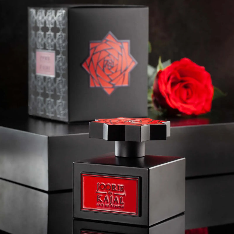 Die Kreation von Joorie wurde von Erinnerungen an den Bauernhof inspiriert, den meine Familie während unserer Sommerferien besuchte. Zwei Hektar Land umgaben das kleine Haus, eingezäunt mit Kiefern entlang der Grenzen. Beeren, Feigen, Jasmin, Petunien, Kamillen und Lavendel waren nur einige der vielen Pflanzen, die wir in den Gärten hatten. Am majestätischsten war jedoch der Rosenstrauch, der die schönsten roten Blüten hervorbrachte, und es war diese Pflanze, die ich täglich besuchte - nicht nur, um die erhabenen samtigen roten Blütenblätter und die überragende Eleganz der Rosen zu sehen, sondern auch, um einen Hauch des sinnlichen Parfums einzufangen, das diese Rose so elegant verströmte." - Moe Khalaf (Gründer & Kajal Creative Officer).