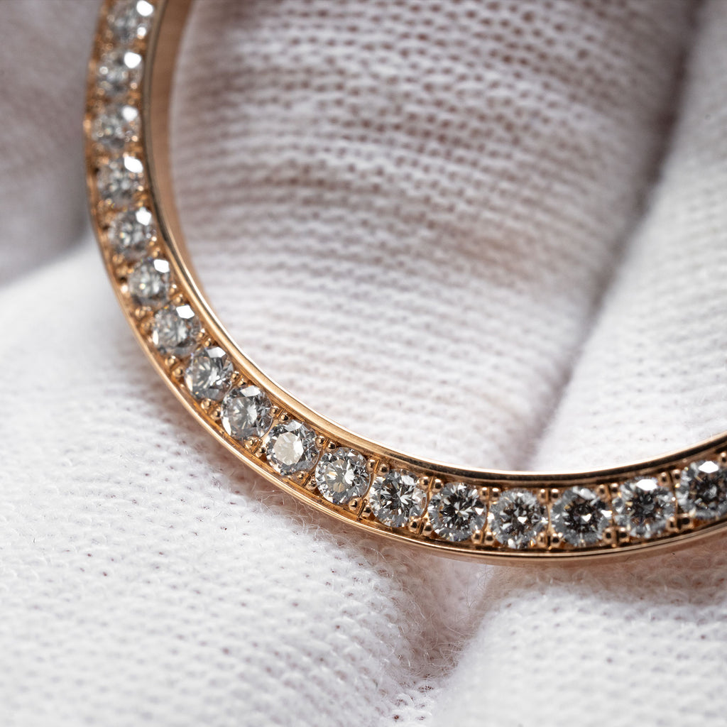 Tauchen Sie ein in die Welt des Luxus mit unserer exquisiten Lünette für die Rolex Datejust 31. Gefertigt aus edlem 750er Rosegold und verziert mit 48 strahlenden Brillanten von insgesamt 1,02 Karat, setzt diese Aftermarket-Lünette neue Maßstäbe in Sachen Eleganz und Stil.