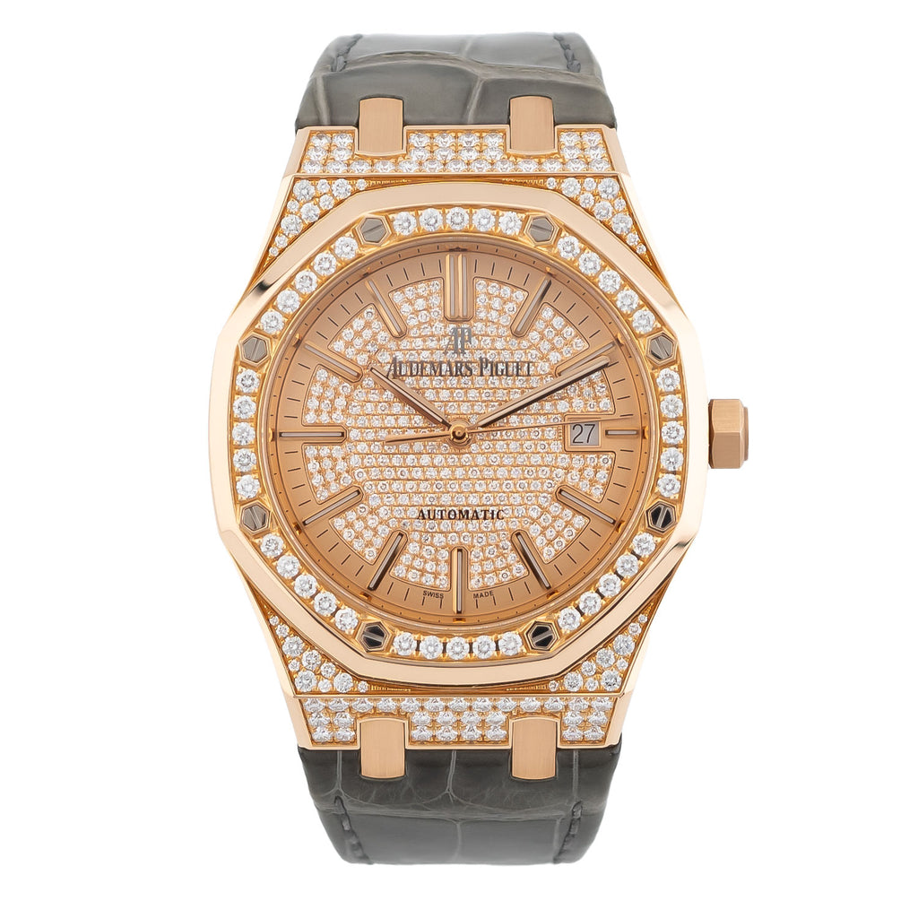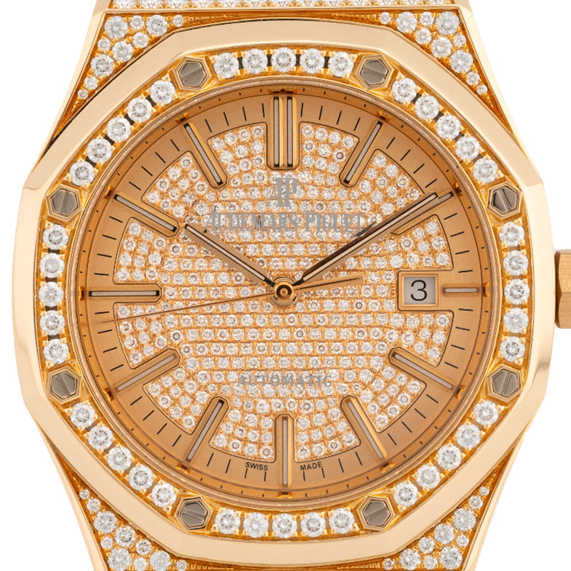 Die Royal Oak Pave Diamond Dial 2015 - 15402OR.ZZ.D003CR.01 ist eine luxuriöse und extravagante Interpretation der ikonischen Royal Oak von Audemars Piguet, die mit funkelnden Diamanten und raffinierten Details beeindruckt.