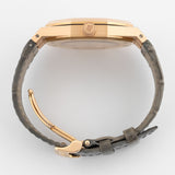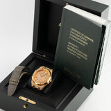 Das 37mm Gehäuse aus 18 Karat Roségold strahlt eine zeitlose Eleganz aus und ist mit brillanten Diamanten besetzt, die das gesamte Gehäuse und die Lünette umrahmen. Diese funkelnde Fassung verleiht der Uhr eine unvergleichliche Pracht und lässt sie im Licht glänzen.