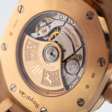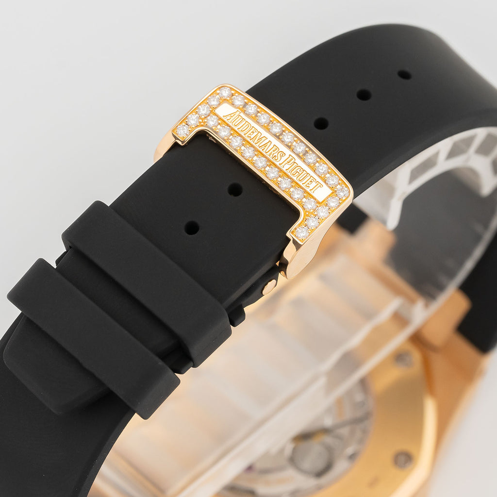 Das mechanische Uhrwerk im Inneren der Royal Oak Pave Diamond Dial 2015 - 15402OR.ZZ.D003CR.01 sorgt für höchste Präzision und Zuverlässigkeit und kann durch den Saphirglasboden bewundert werden. Diese Uhr ist nicht nur ein Symbol für Luxus, sondern auch für Handwerkskunst und technische Raffinesse.