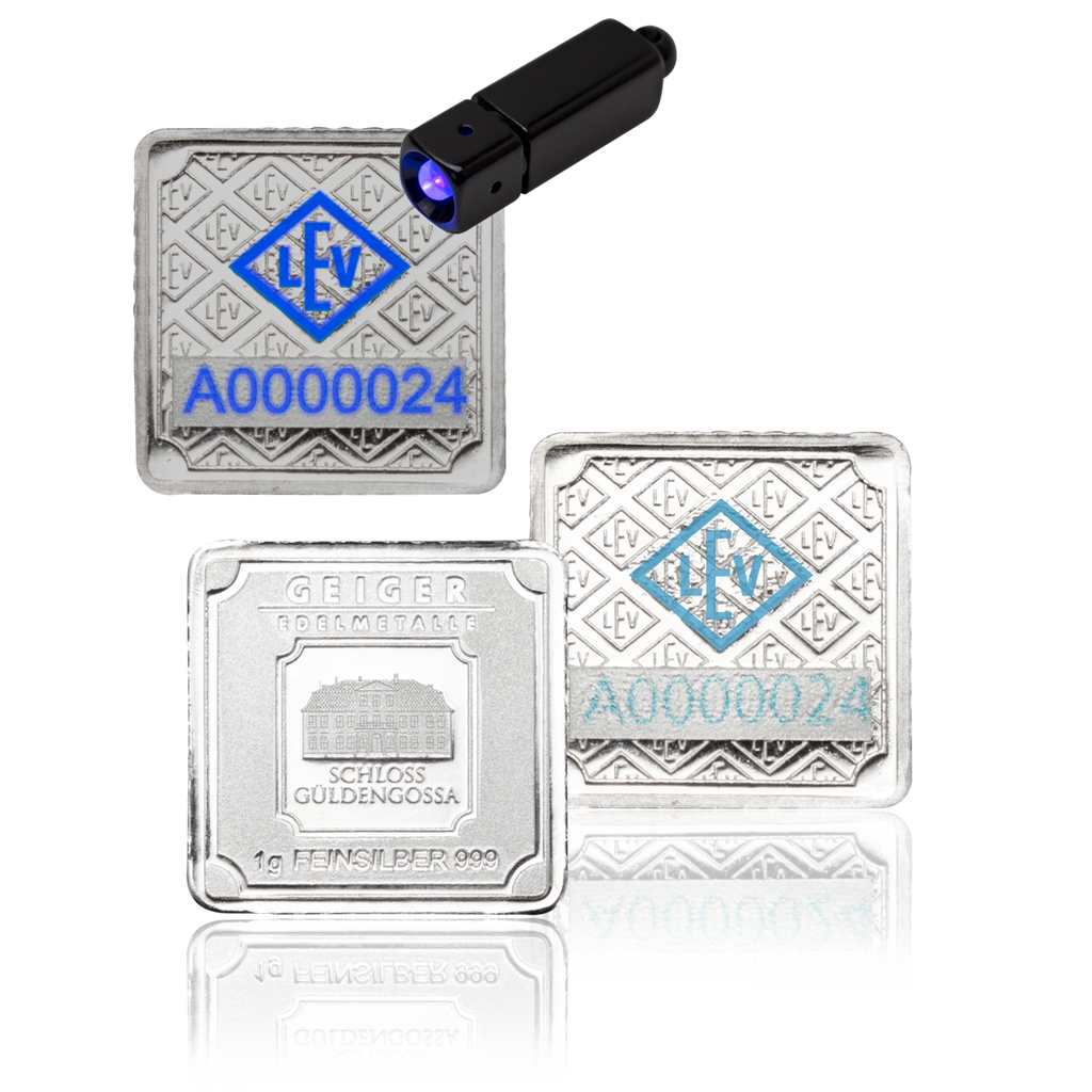 Hohes Relief mit einer pearl-finish-Oberfläche, paaren sich mit einem besonders geriffelten Rand, wie man ihn von Münzprägungen kennt. Eine wirkliche Neuerung ist die individuell, auf den Barren aufgebrachte Seriennummer, welchen jeden Barren rückverfolgbar machen und die einzigartige UV Beschichtung, welche unter Schwarzlicht das LEV Logo der Herstellerfirma und die Seriennummer aufleuchten lassen. Diese exklusiven Sicherheitsmerkmale haben wir gepaart mit einer innovativen Verpackung.