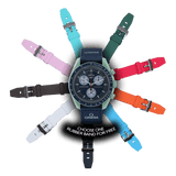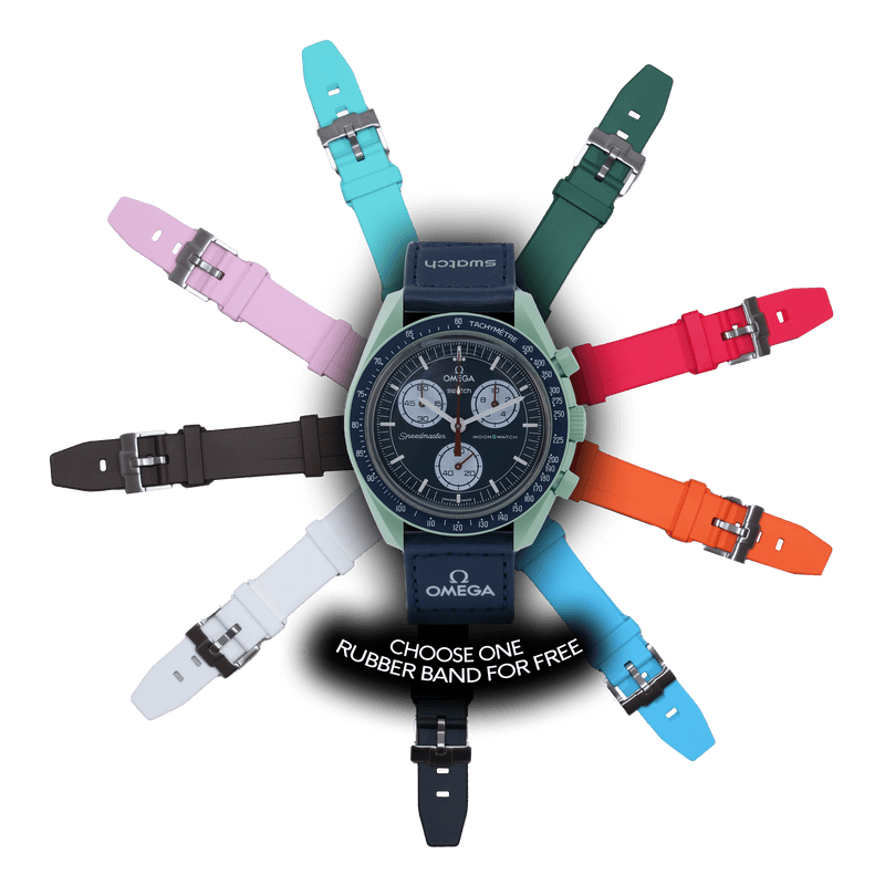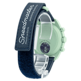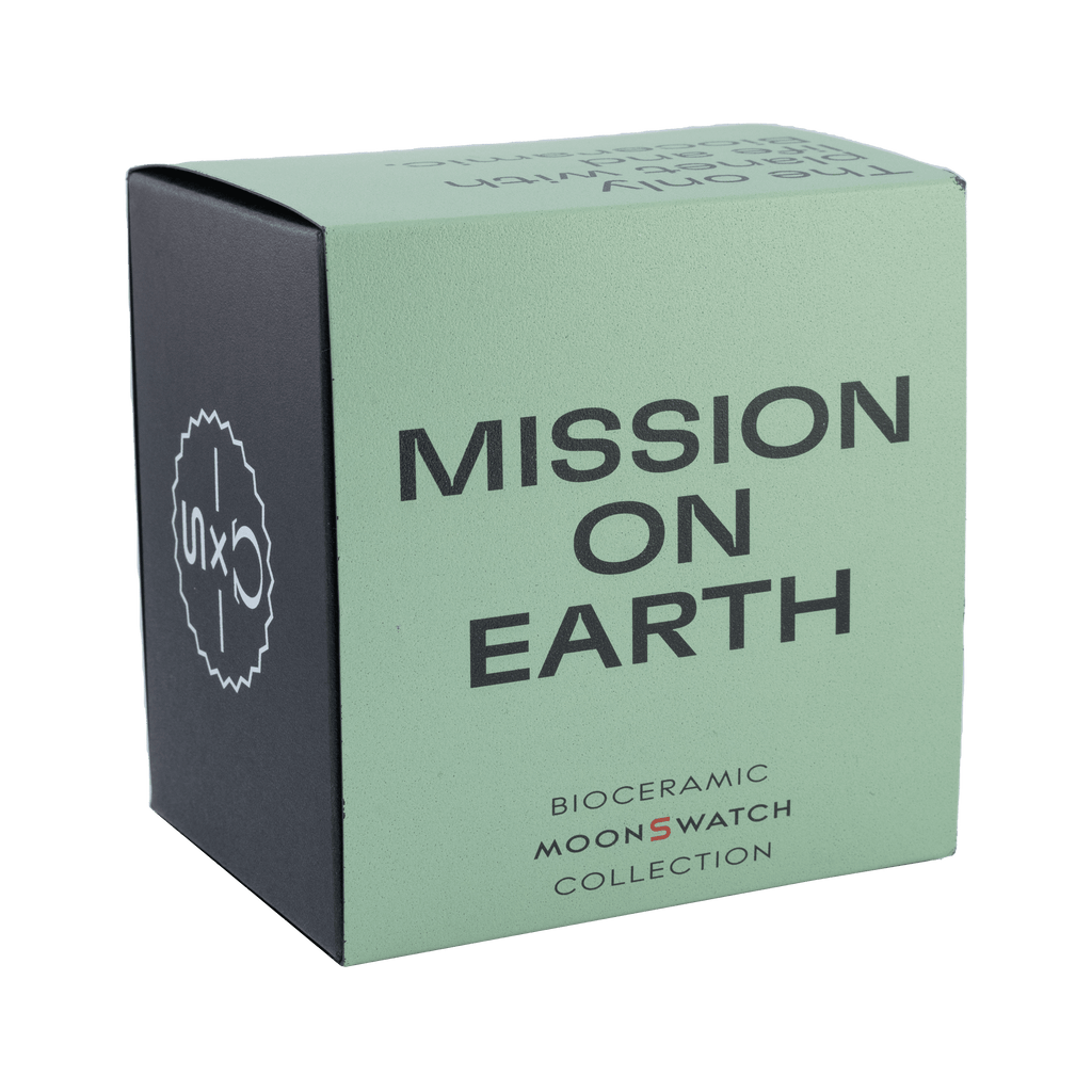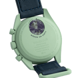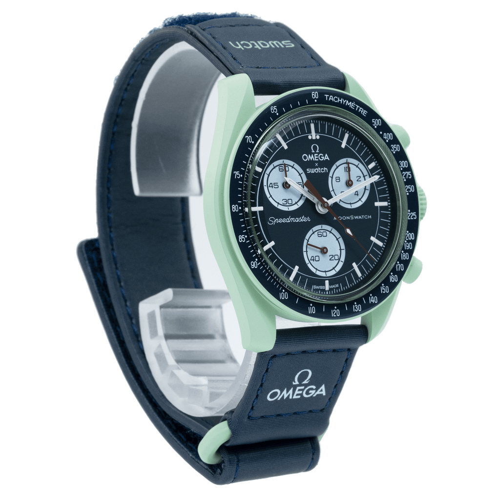 Umweltbewusste Astronauten werden diese erdgrüne Uhr mit marineblauem VELCRO©-Armband lieben. Der Sekundenzeiger des Chronographen und die Zeiger der Totalisatoren sind in Braun, die Totalisatoren sind in Weiß gehalten. Ebenso wie die Tachymeterskala auf dem blauen Hintergrund der Lünette. Die Zifferblätter sind mit dem OMEGA X SWATCH Branding, sowie dem legendären Speedmaster Logo und dem neuen MoonSwatch Logo versehen. Alle Modelle bieten folgende Features, die für eine ausgeprägte Liebe zum Detail stehen: die Glaskonstruktion mit dem kaum sichtbaren „S“ in der Mitte des Glaskörpers, das edle und raffinierte, kreisförmige Muster auf dem äußeren Ring des Zifferblatts und den Totalisatoren, die kantig-fließende Konstruktion der Bandanstöße, den legendären „Punkt über der Neunzig“ auf der Tachymeterskala der Lünette und natürlich die einzigartige Bioceramic-Optik und -Haptik. Sämtliche Stunden-, Minuten- und Sekundenzeiger des Chronographen sowie die Stundenmarkierungen sind mit Superluminova versehen und leuchten perfekt im Dunkeln.