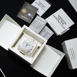 Die "Mission to the Moonphase - Snoopy" Uhr ist eine Hommage an den Vollmond, gekennzeichnet durch ihr vollständig weißes Design. Das Gehäuse, die Krone und die Drücker sind aus Biokeramik gefertigt, während das Armband aus VELCRO© besteht. Der Chronographen-Sekundenzeiger, die Zeiger der Hilfszifferblätter und die Tachymeterskala der Lünette sind in Schwarz gehalten, während die Hilfszifferblätter und der Hintergrund der Lünette weiß sind.