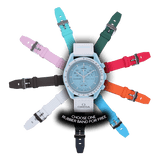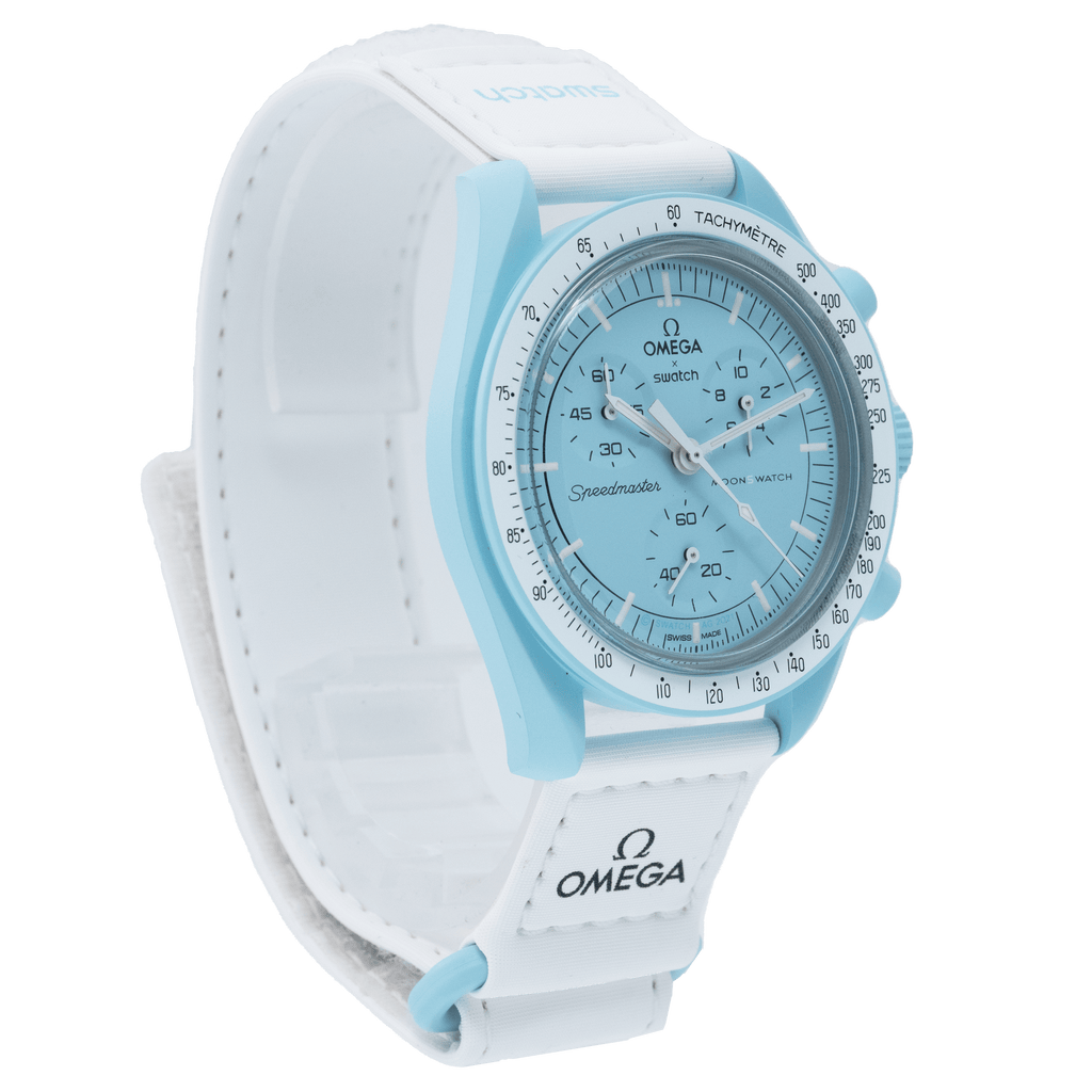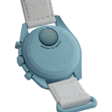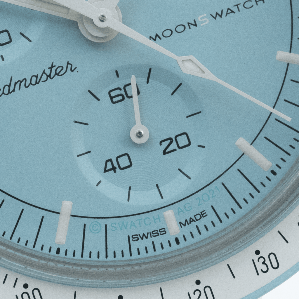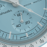 Bei dieser Mission treffen ein luftiges Pastellblau und ein strahlend weißes VELCRO©-Armband aufeinander. Der Sekundenzeiger des Chronographen, die Zeiger der Totalisatoren und die Tachymeterskala sind ebenfalls in Weiß gehalten. Die Zifferblätter sind mit dem OMEGA X SWATCH Branding, sowie dem legendären Speedmaster Logo und dem neuen MoonSwatch Logo versehen. Alle Modelle bieten folgende Features, die für eine ausgeprägte Liebe zum Detail stehen: die Glaskonstruktion mit dem kaum sichtbaren „S“ in der Mitte des Glaskörpers, das edle und raffinierte, kreisförmige Muster auf dem äußeren Ring des Zifferblatts und den Totalisatoren, die kantig-fließende Konstruktion der Bandanstöße, den legendären „Punkt über der Neunzig“ auf der Tachymeterskala der Lünette und natürlich die einzigartige Bioceramic-Optik und -Haptik. Sämtliche Stunden-, Minuten- und Sekundenzeiger des Chronographen sowie die Stundenmarkierungen sind mit Superluminova versehen und leuchten perfekt im Dunkeln.