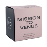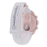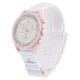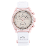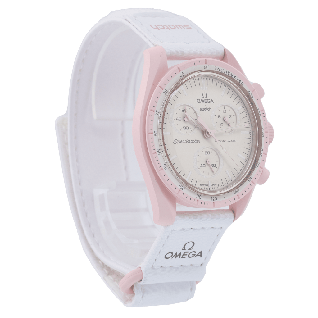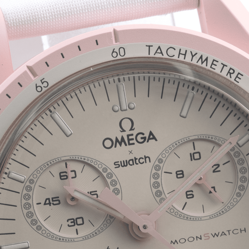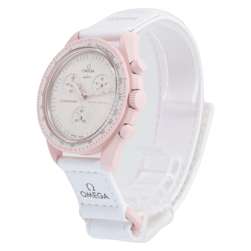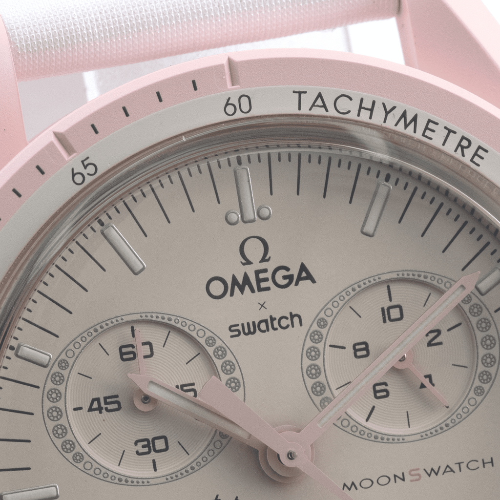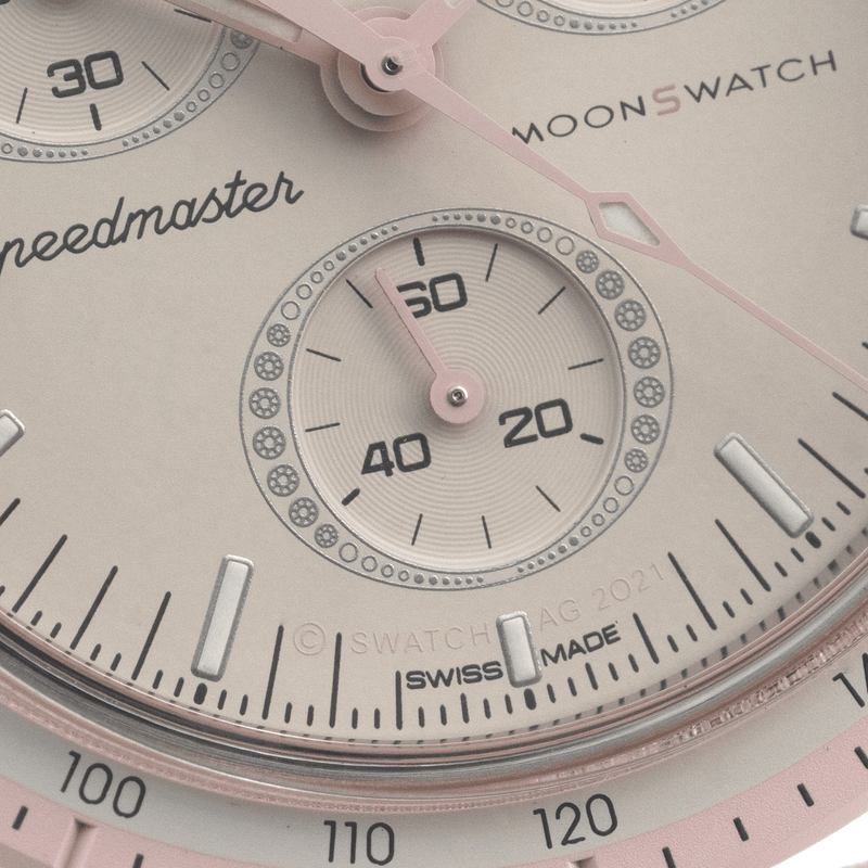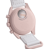 Bei dieser eindrucksvollen Uhr bildet das weiße VELCRO©-Armband den perfekten Kontrast zum pudrigen Pastellrosa. Ovale Totalisatoren mit diamantähnlichen Details an den Rändern verleihen der Uhr einen Hauch von femininer Eleganz. Die Stunden-, Minuten- und Sekundenzeiger des Chronographen und die Zeiger der Totalisatoren sind ebenfalls roséfarben. Die Zifferblätter sind mit dem OMEGA X SWATCH Branding, sowie dem legendären Speedmaster Logo und dem neuen MoonSwatch Logo versehen. Alle Modelle bieten folgende Features, die für eine ausgeprägte Liebe zum Detail stehen: die Glaskonstruktion mit dem kaum sichtbaren „S“ in der Mitte des Glaskörpers, das edle und raffinierte, kreisförmige Muster auf dem äußeren Ring des Zifferblatts und den Totalisatoren, die kantig-fließende Konstruktion der Bandanstöße, den legendären „Punkt über der Neunzig“ auf der Tachymeterskala der Lünette und natürlich die einzigartige Bioceramic-Optik und -Haptik. Sämtliche Stunden-, Minuten- und Sekundenzeiger des Chronographen sowie die Stundenmarkierungen sind mit Superluminova versehen und leuchten perfekt im Dunkeln.